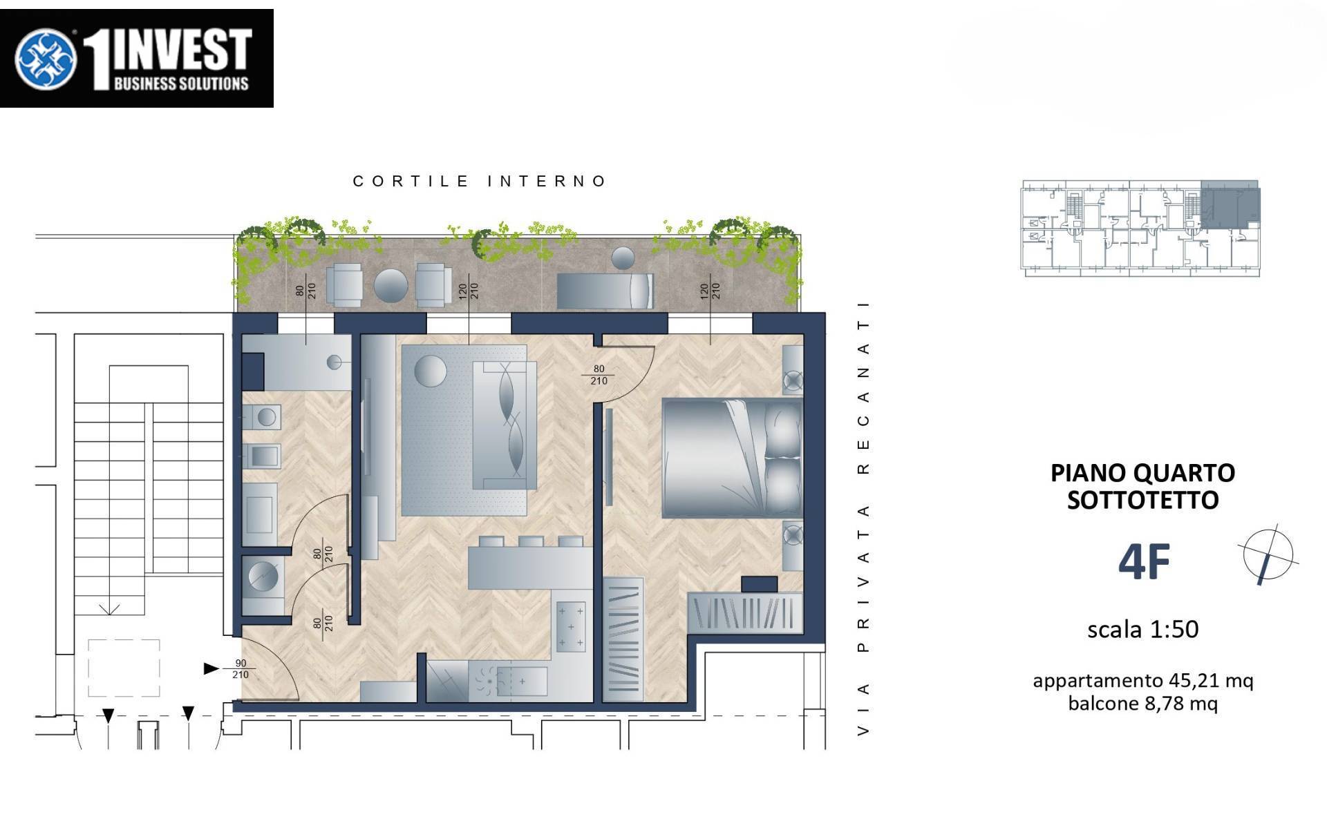 Ideale per investimento a reddito o per abitazione. In nuova sopraelevazione con consegna prevista ottobre 2026, proponiamo bilocale al quarto e ultimo piano, realizzato con struttura in legno lamellare e involucro altamente isolato, secondo criteri costruttivi che hanno consentito all'intero intervento di raggiungere la classe energetica A. L'appartamento gode di doppia esposizione, elemento che assicura un'eccellente luminosità naturale durante tutto l'arco della giornata. La zona giorno, affacciata sul cortile interno, si apre su una balconata accessibile tramite un fronte continuo di aperture, valorizzando il rapporto tra interno ed esterno. Il balcone è rifinito con pavimentazione strutturata antiscivolo. Il living si sviluppa in un ambiente lineare e ben proporzionato, con cucina a vista e predisposizioni impiantistiche integrate da capitolato: tubazioni sfilabili, impianto elettrico Living Now e predisposizione per cappa aspirante con esalazione dedicata. La camera da letto, posta sul fronte opposto verso Via Privata Recanati, garantisce maggiore riservatezza e ottime prestazioni acustiche grazie a divisori in cartongesso a doppia lastra con interposto isolante in lana minerale. Il bagno, adiacente alla zona giorno, è previsto con sanitari sospesi, piatto doccia in resina effetto pietra, rubinetteria di design e scalda salviette. L'unità è dotata di impianto di climatizzazione a pompa di calore con fan coil interni; la produzione di acqua calda sanitaria è affidata a boiler da 80 litri. A supporto dell'efficienza energetica è presente un impianto fotovoltaico condominiale da 2,5 kW, che contribuisce alla riduzione dei consumi. Completano la dotazione: - Serramenti in PVC a taglio termico con doppio vetro - Predisposizione per tende ombreggianti elettrificate - Tapparelle in alluminio coibentato motorizzate - Portoncino blindato classe 3 - Finiture interne personalizzabili, con pavimenti e rivestimenti in gres porcellanato di primaria marca Una soluzione abitativa dal design contemporaneo, progettata per offrire comfort, efficienza energetica e qualità costruttiva, ideale sia come abitazione principale sia come investimento, all'interno di un intervento di rigenerazione urbana in una zona ben collegata di Milano. Pagamenti su misura.